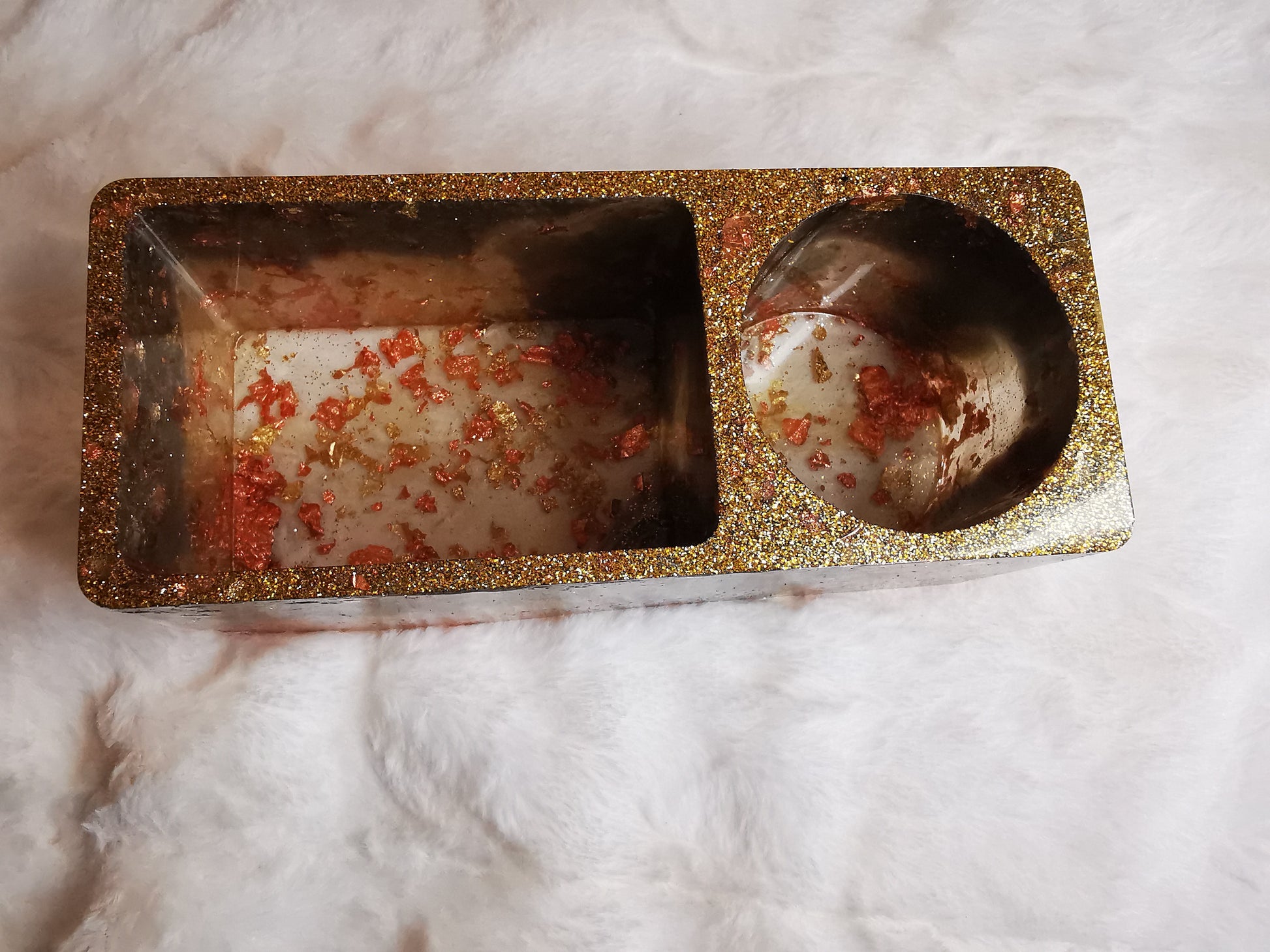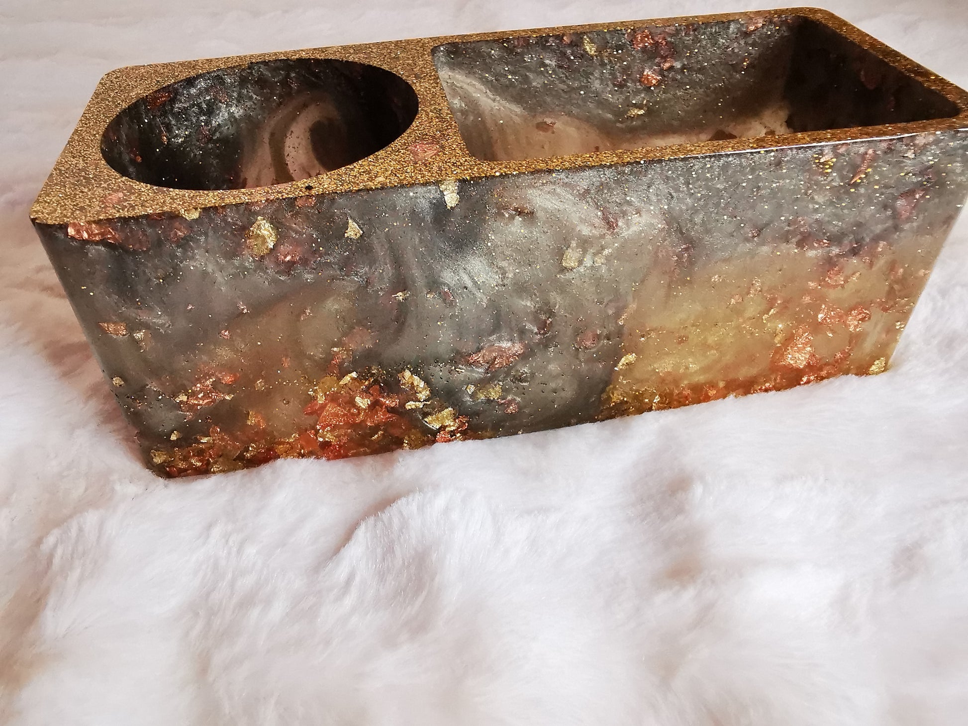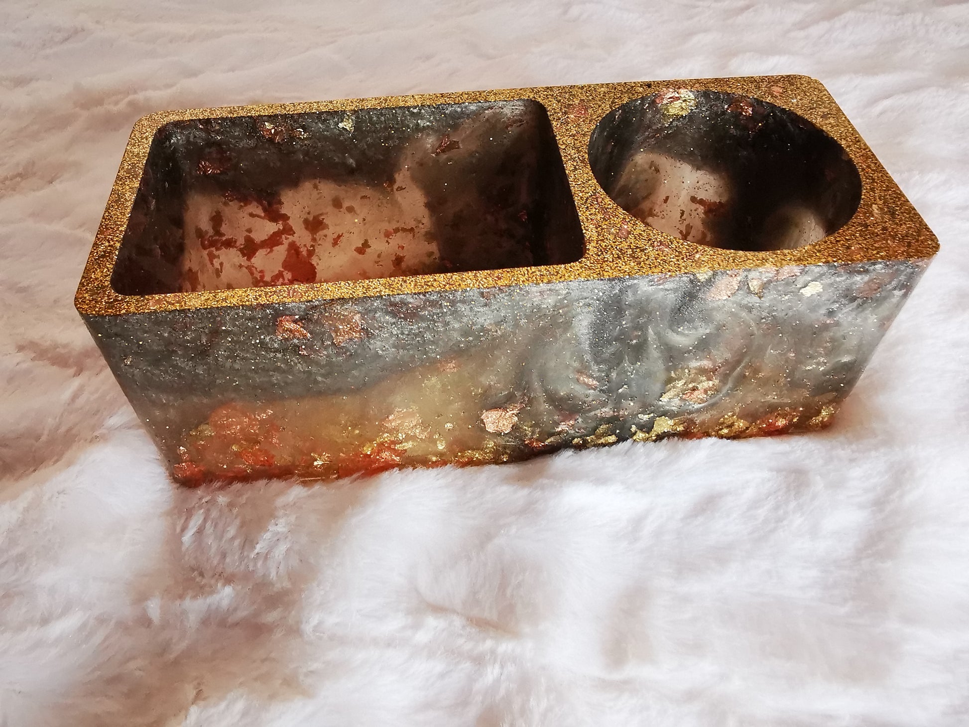 grand pot a crayon pailleté avec des feuilles d'or et cuivré